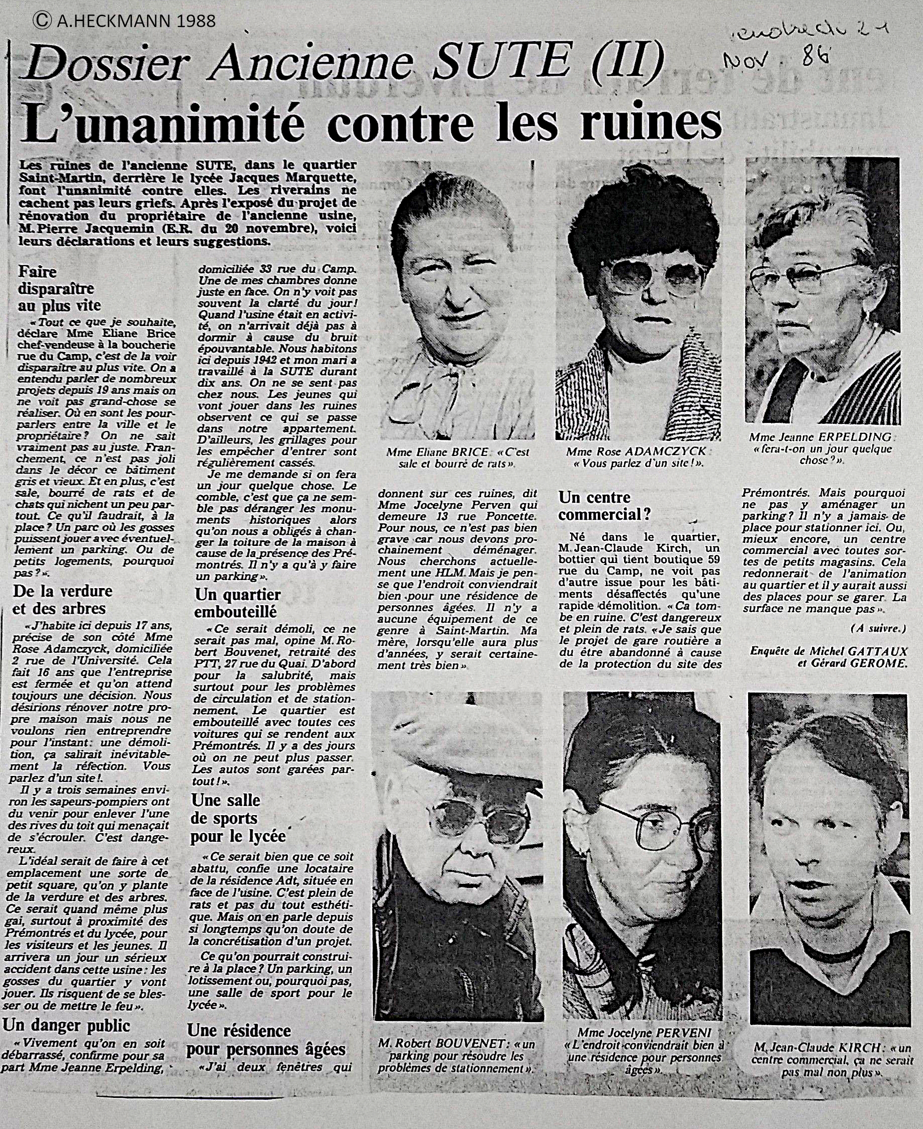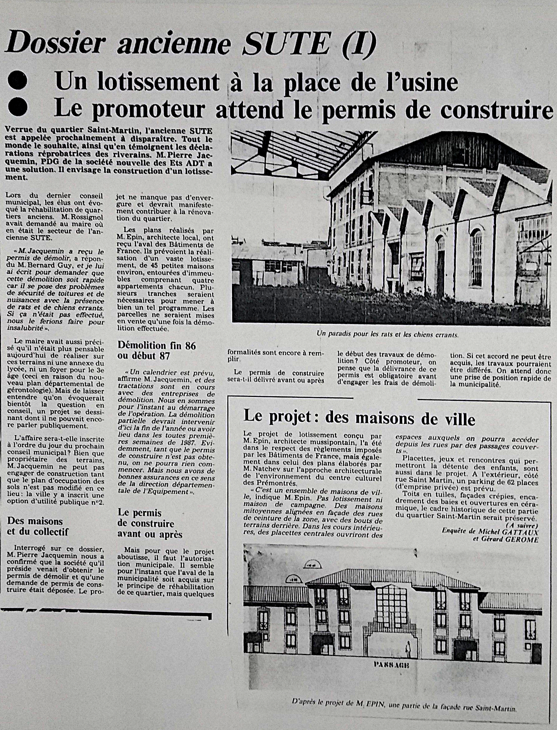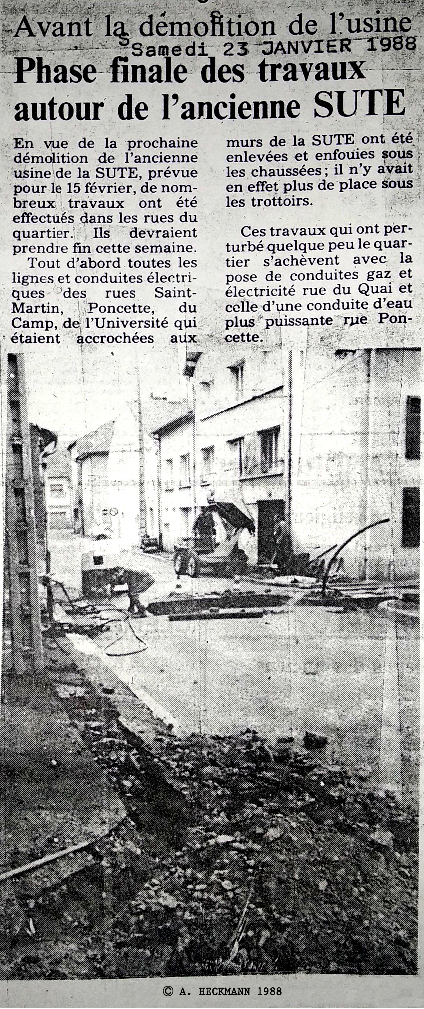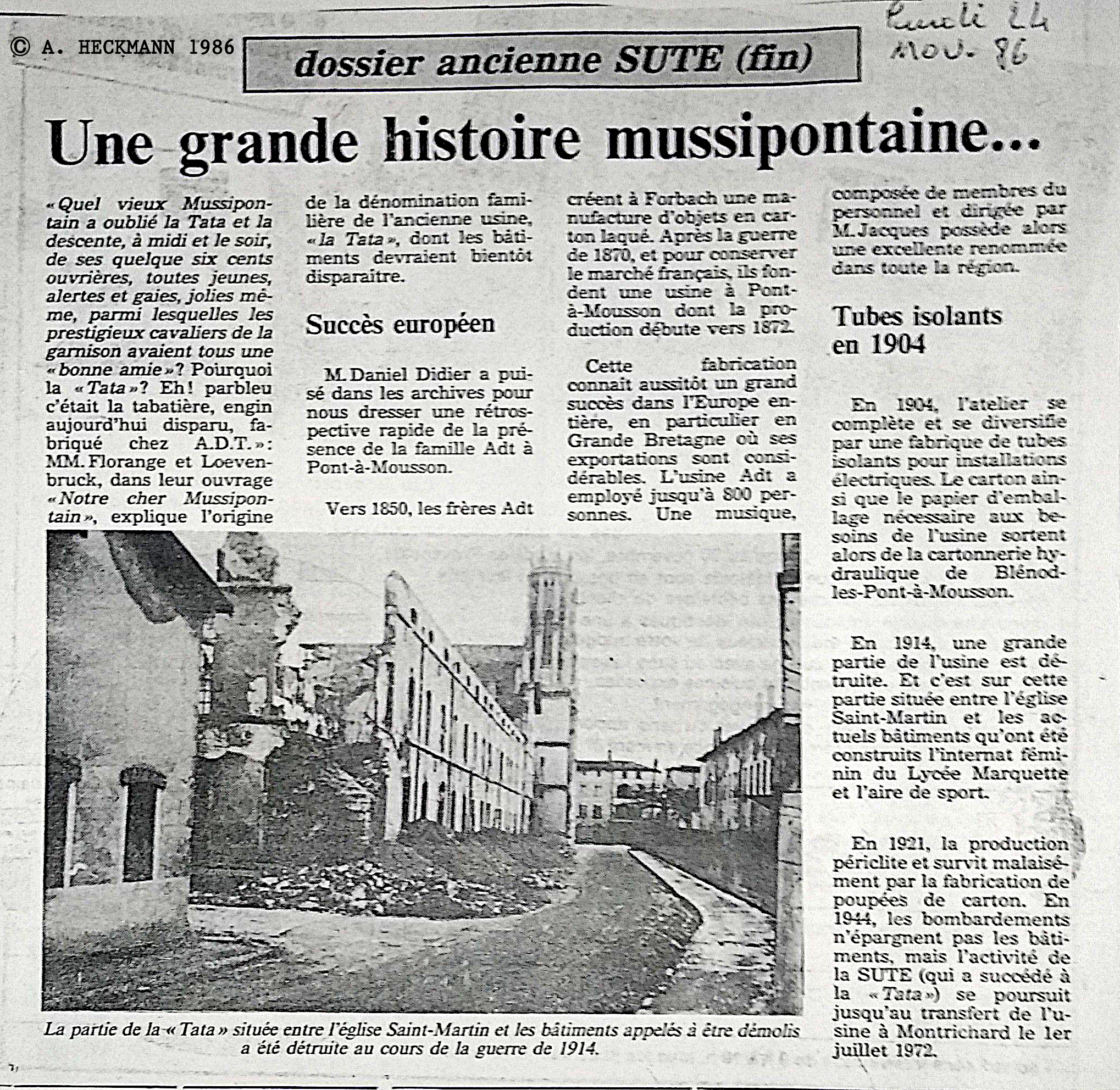 Elle aura succédé à l'entreprise ADT et aura fabriqué du tube électrique durant des années. Les bâtiments délabrés de la S.U.TE rue St-Martin vont être détruits pour laisser place à des projets immobilier qui ont partiellement vu le jour et dont les bâtiments étaient là juste pour empêcher la mairie d'intervenir sur le terrain car le propriétaire en voulait des sommes astronomiques, il aura fallu aussi dépolluer le site et le propriétaire refusait. Cette histoire à finis au tribunal. L'usine de la S.U.T.E existe toujours mais celle-ci fut reconstruit ailleurs à Pont-à-Mousson pour se moderniser et s'agrandir. Voici quelques articles de l'époque que je vous invite à lire sur le projet de démolition. Souvenir des Mussipontains riverains et de ceux qui y ont travaillé.